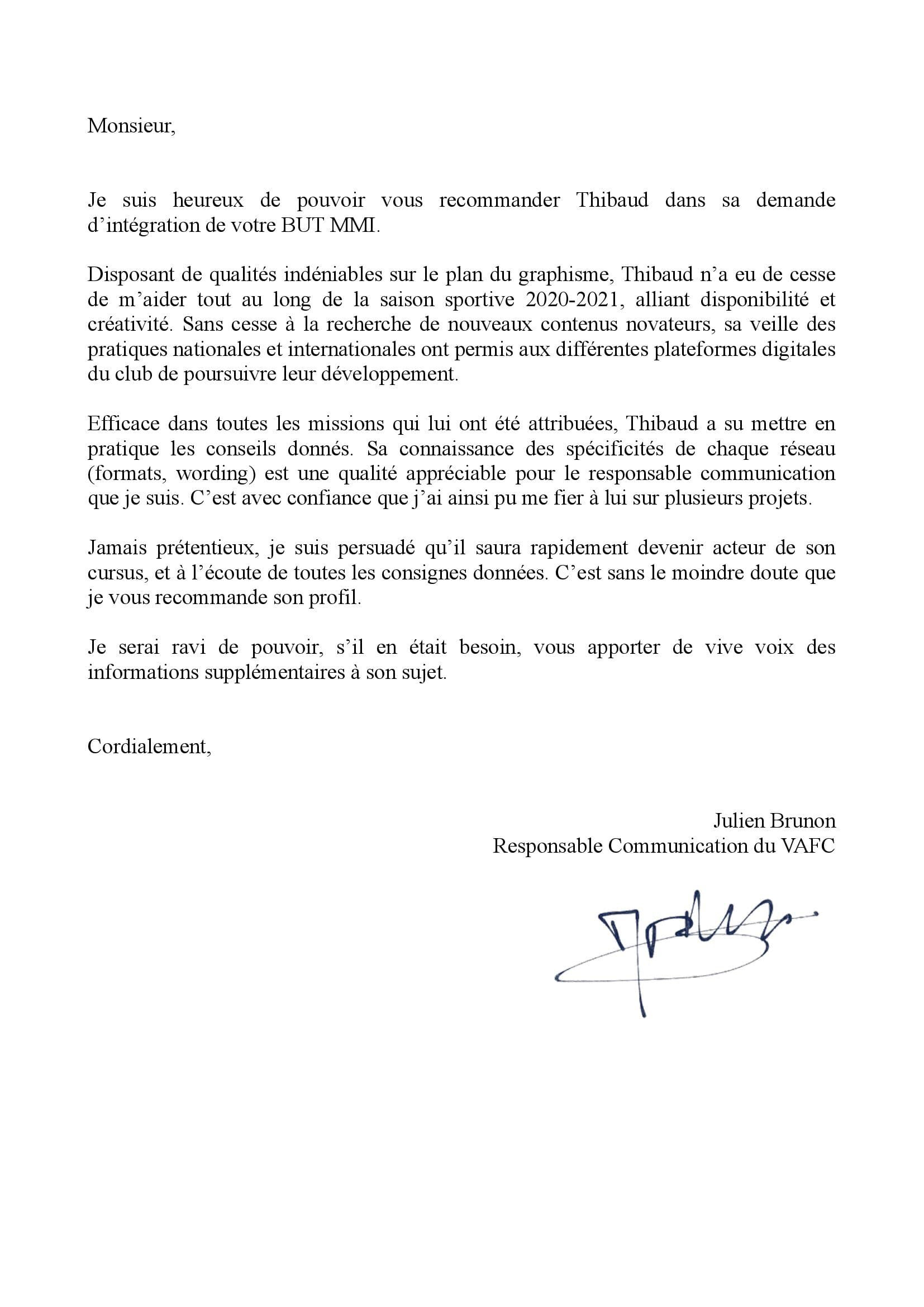 Lettre de recommandation de Julien BRUNON, Responsable Communication du VAFC.